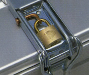 コンテナーの掛金具に南キン錠を取り付けて施錠できます。1set 2,000円(税別)
